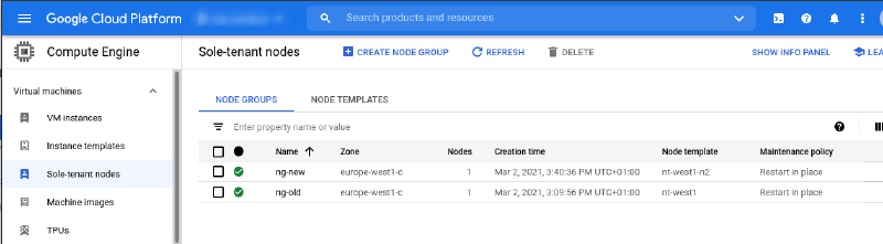 In my environment I have two sole-tenant nodes. One named ng-old running on N1 in europe-west1-c and another one named ng-new running on N2 in europe-west1-c :