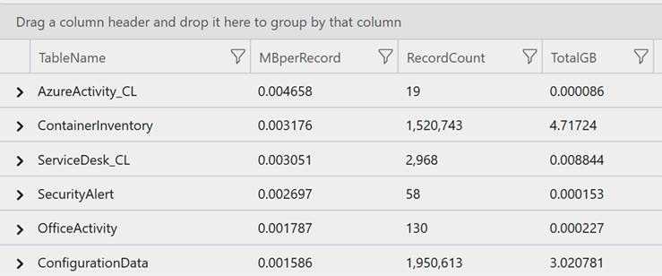To calculate the data volume we make use of the telemetry that Log Analytics writes to each workspace where we can find the usage information for each data type. We then do some join magic and out comes a nice view that can be used to estimate volume (credit for this improved version goes to my colleague Clive Watson).